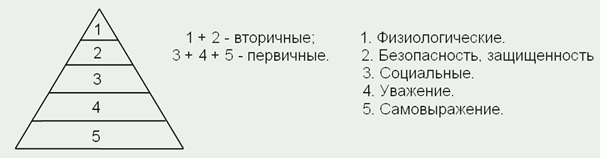 Теория Маслоу основана на иерархии потребностей. Он создавал свою теорию мотивации в 40-е гг. Маслоу признавал, что люди имеют множество потребностей, но полагал, что эти потребности могут быть разделены на 5 основных категорий: